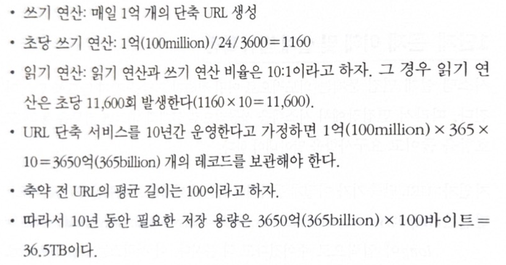 p.139 “어떻게 동작해야 하는지 예제…트래픽 규모…매일 1억(100million) 개의 단축 URL을 만들어 낼 수 있어야 합니다…단축 URL의 길이…짧으면 짧을수록 좋습니다…단축 URL에 포함될 문자에 제한이 있습니까?…숫자(0부터 9까지)와 영문자(a부터 z, A부터 Z까지)만…단축된 URL을 시스템에서 지우거나 갱신할 수 있습니까?…삭제나 갱신은 할 수 없다고 가정”