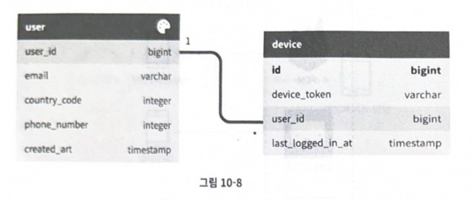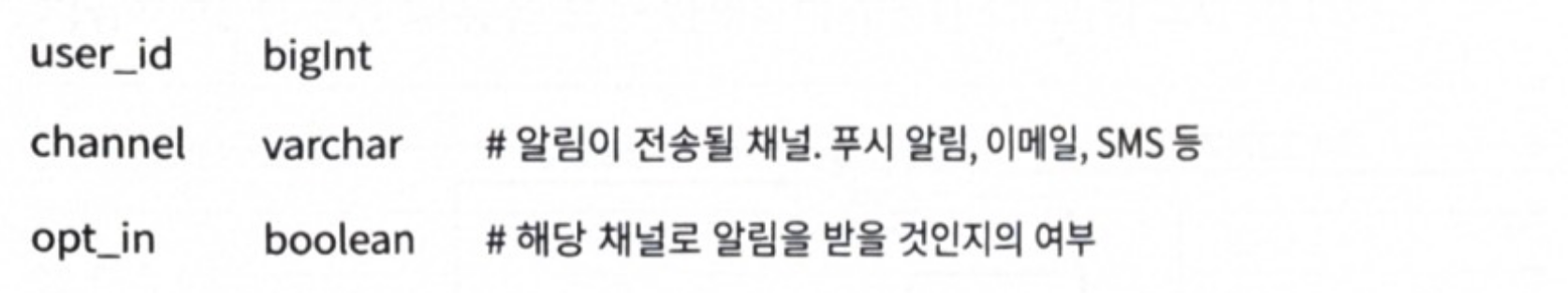 p.187 “이 정보는 알림 설정 테이블에 보관되며, 이 테이블에는 아마 다음과 같은 필드들이 필요할 것”