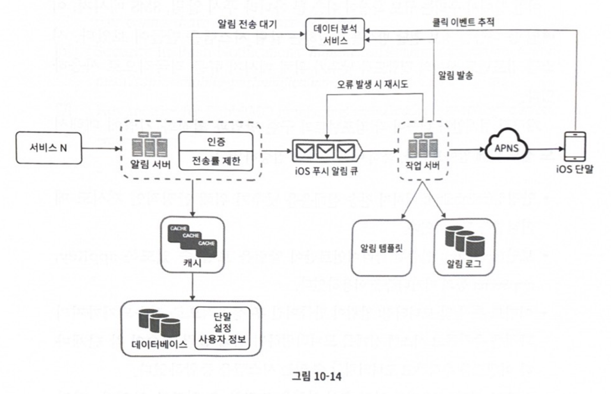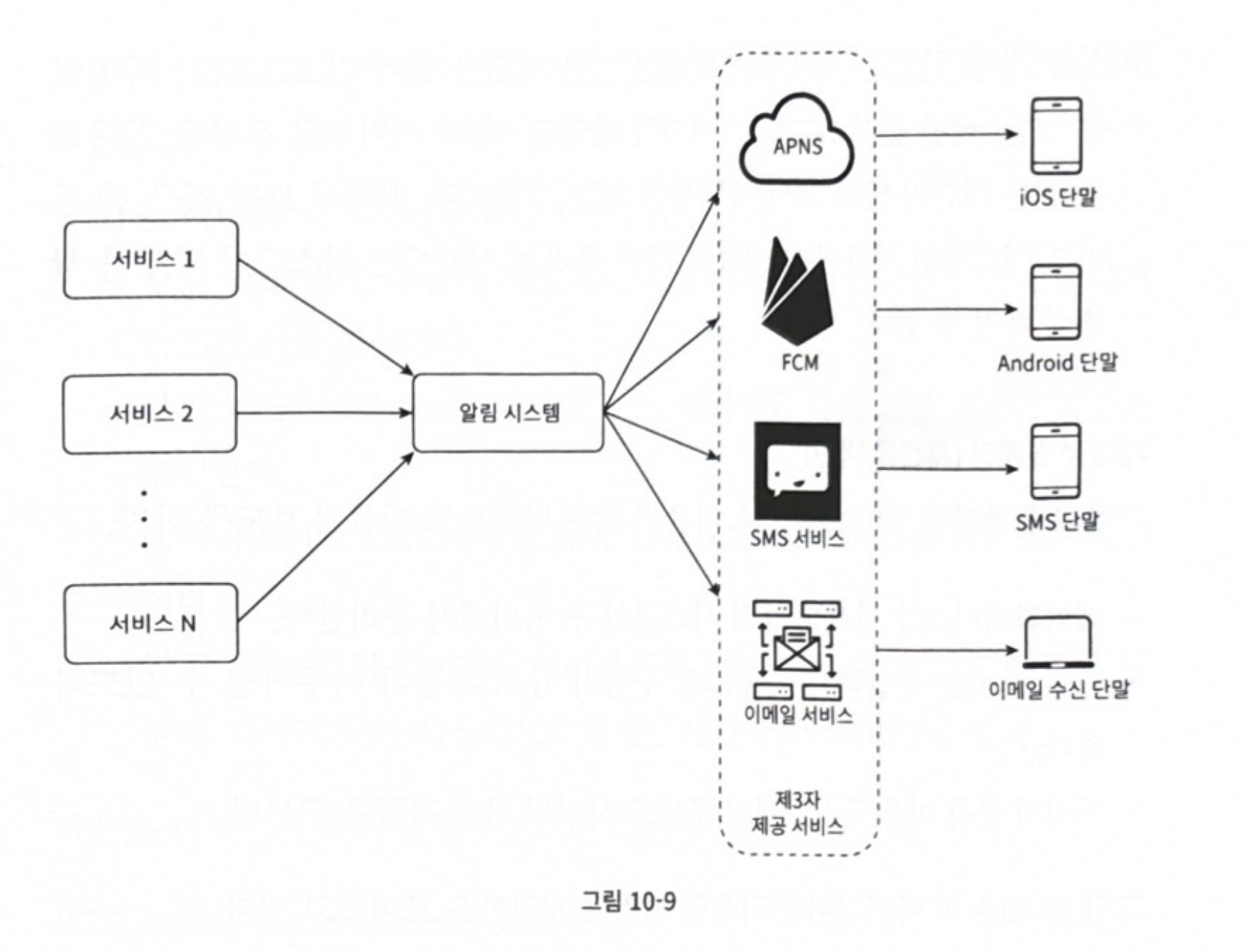 p.180 “알림 시스템(notification system)…서비스 1~N에 알림 전송을 위한 API를 제공해야 하고, 제3자 서비스에 전달할 알림 페이로드(payload)를 만들어 낼 수 있어야 한다.”
