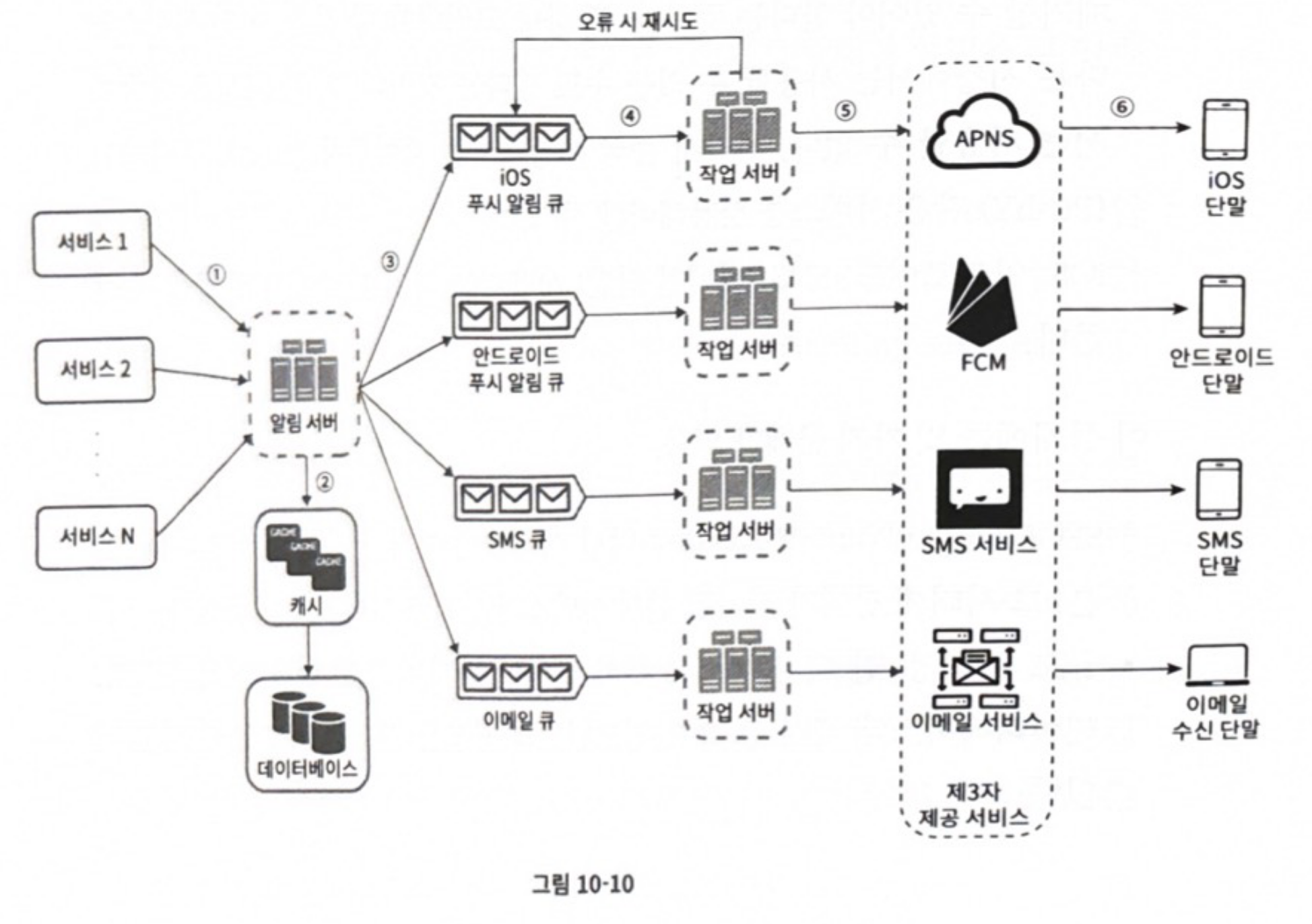 p.187 “해당 알림을 재시도 전용 큐에 넣는다. 같은 문제가 계속해서 발생하면 개발자에게 통지”